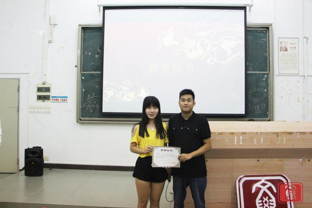 活动在全体同学奏唱团歌中拉开序幕。一曲过后,在会上播放了由我系团学制作的户外团生活动视频和采访,通过视频可以更生动直接地为大家展示户外团生活动的乐趣,使同学们了解到此次团生活动的意义。接着,由经济与金融系歌手队队员王静给我们带来歌曲《至少还有你》,动听的歌声感染了全场观众,活跃了现场的气氛,还有我们准备的猜歌名和电影名的小游戏,得到了同学们的踊跃参与,把现场气氛推向高潮。随后进行的是15级班级团生活动展示,各班代表通过ppt向我们展示他们班举办的团生活动情况,他们在进行团生活动中通过游戏和国防知识普及,加深了同学们对国防知识的了解,提高了同学们参与活动的积极性,还增强了班级的凝聚力。在现场观众进行投票时,主持人还进行了国防知识有奖问答环节,使同学们对我国国防知识有了更深的认识和了解。通过现场观众投票,15级汉语言文学3班获得九月团生活动最佳人气奖。