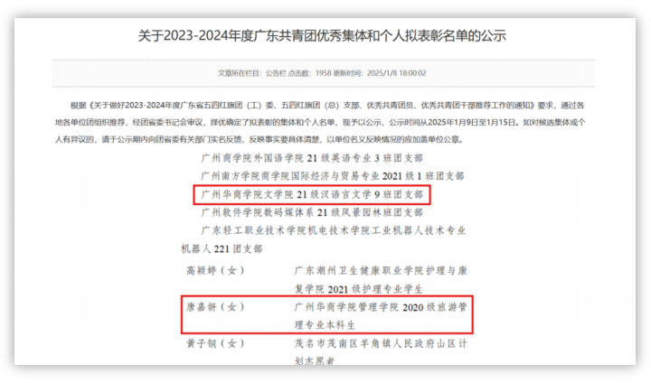 近日 , 共青团广东省委员会发布了2023—2024年度广东省五四红旗团 ( 工) 委 、 五四红旗团(总) 支部 、 优秀共青团员和优秀共青团干部名单,我校bv伟德国际194621级汉语言文学9班团支部荣获“广东省五四红旗团支部”,管理学院优秀校友唐嘉妍荣获“广东省优秀共青团员”。