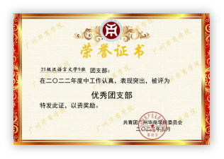 21级汉语言文学9班团支部在思想阵地建设中不断开辟新路径 、 新形式 ,获2022年广东省 高校“活力在基层”主题团日竞赛活动春季赛季“百优”“千入围”项目; 获2022年度优秀团支部等称号。 团支部成员先后获优秀实习生; 5 人获评“学校文明安全纪律教育月先进个人” , 部分成员荣获“优秀共青团干部”“优秀共青团员”“优秀志愿者”等荣誉称号。