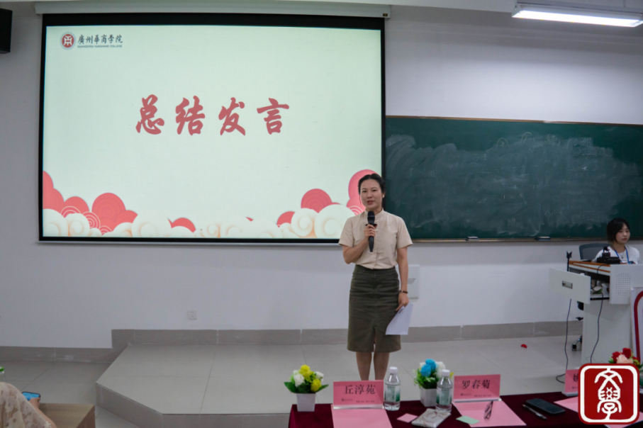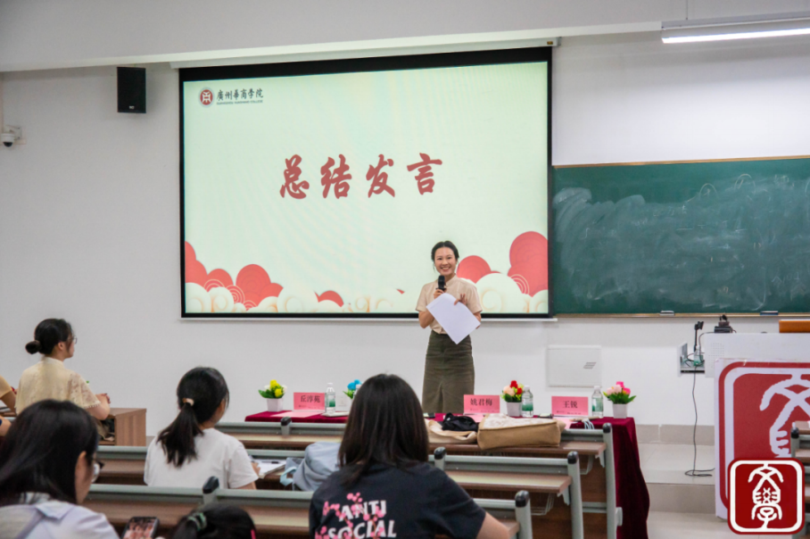 在选手们完成精彩的展示后,罗春菊老师上台为本次大会进行总结。罗老师首先向全体参与人员致以诚挚感谢,同时也肯定了决赛演出的精彩纷呈。回顾初复赛,她客观指出了同学们的不足,其中读音的精准把控与时间的合理分配问题尤为突出,也希望同学们在今后的学习中打磨改进。