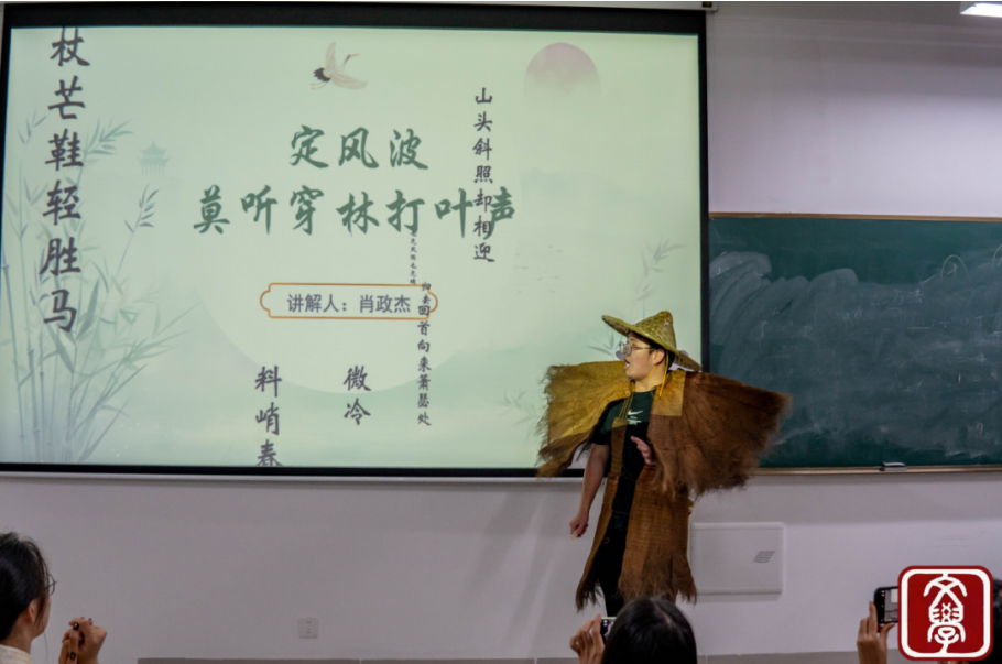 8号选手肖政杰头戴斗笠,身披蓑衣,执苏轼《定风波》的竹,在“莫听穿林打叶声”的吟诵中踏雨而行。他的语调随“竹杖芒鞋轻胜马”扬起酒脱,手势如拂去箬笠烟岚。说到“也无风雨也无晴”时,目光沉静如潭,将东坡居士“一蓑烟雨任平生”的豁达,化作穿透时空的心灵慰藉。从“莫听”的酒脱,到“何妨吟啸且徐行”的自在,层层深入。