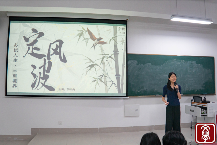2号选手黄昭冉从容登上讲台中央,解读《定风波·苏轼人生三重境界》时,她时而以手势轻挥似拨云见日,展现“谁怕?一蓑烟雨任平生”的无畏,时而凝视远方似与古人对话,传递“回首向来萧瑟处”的淡然。逻辑清晰如溪水流,情感丰沛似江河奔涌,让听众随她的讲述穿梭于词人苏轼的精神世界,感受着那份千古流传的豁达与超然。