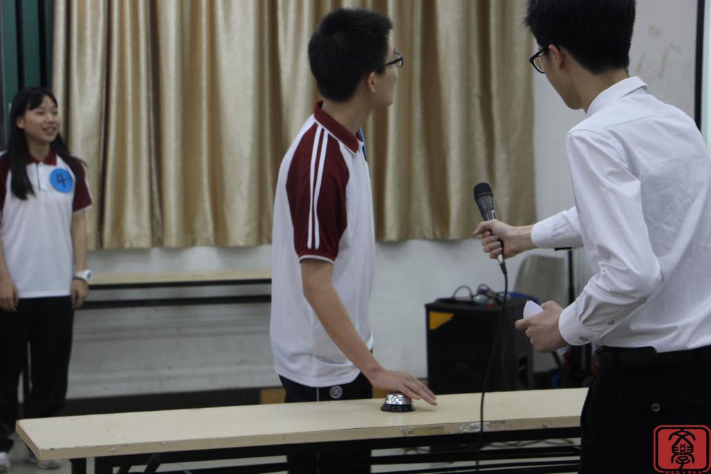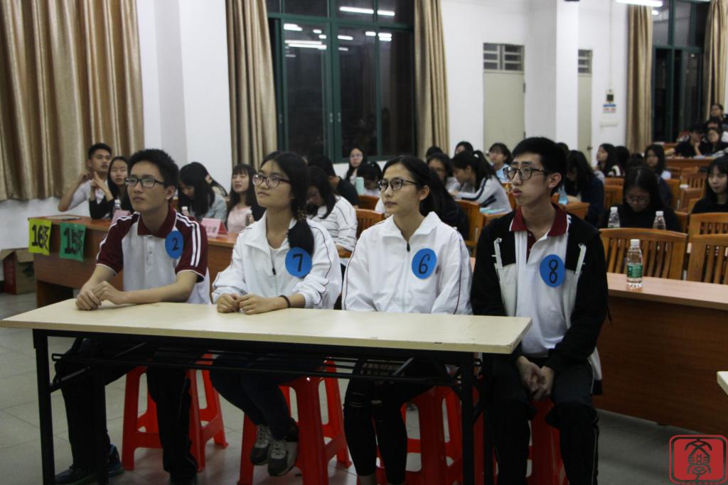 比赛伊始,主持人宣布此次竞赛主要由三个环节构成,并且实行积分制。紧接着,一小段参赛选手的宣言展示让现场充满着紧张的气氛。展示完毕后,第一环节的限时答题便开始了,八位同学同时通过看幻灯片上的题目答题,初始题目虽难度较低,但选手们也丝毫不敢懈怠,都认真地答完了第一环节的题目。