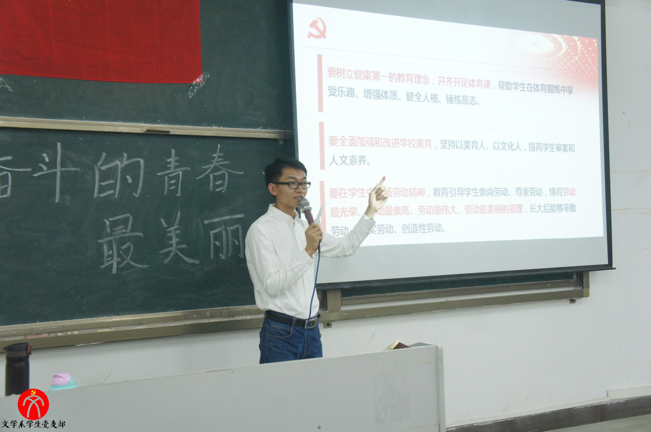 何顺发副书记首先要求各党员同志、发展对象、入党积极分子要认真学习贯彻新版中国共产党支部工作条例,深入学习习近平总书记关于青年的教育和成长的论述,并从十九大,2018年北大师生座谈会,全国教育大会三方面论述青年成长教育的重要意义。