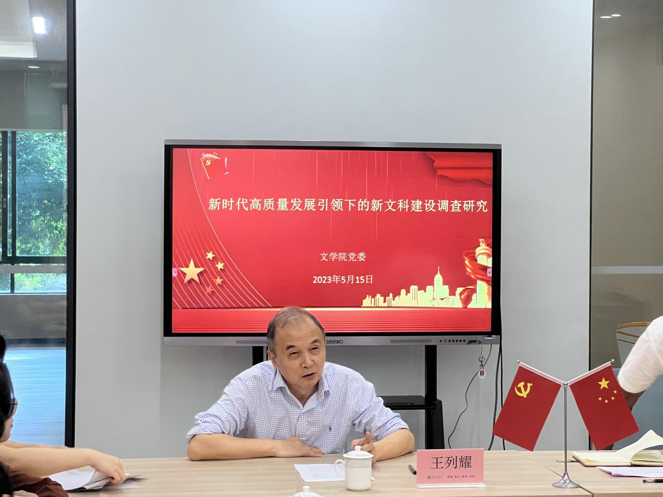为有力推动学习贯彻习近平新时代中国特色社会主义思想主题教育走深走实,5月15日下午,学校副校长王列耀深入我院开展“新时代高质量发展引领下的新文科建设”的主题调研。我院院长苏桂宁、党委副书记郭堪通、副院长蒋家国、李保民、伍世昭以及我院部分教授和老师参与调研座谈。此外,我院邀请北京师范大学bv伟德国际1946中国现当代文学研究所所长沈庆利教授参加本次调研。
