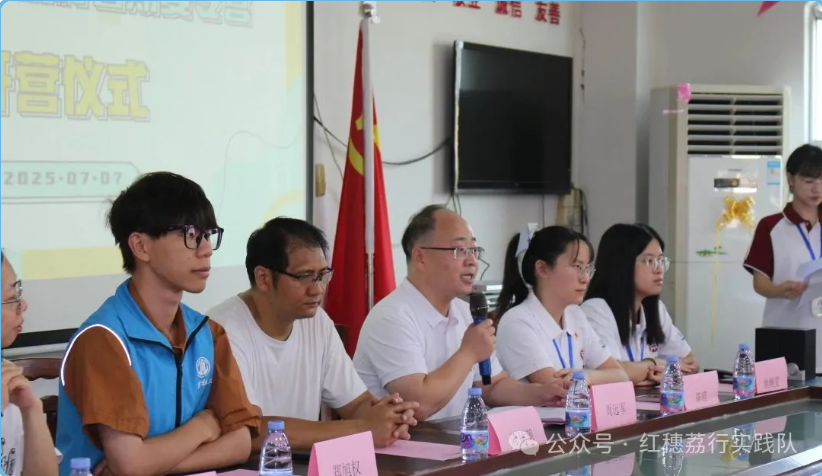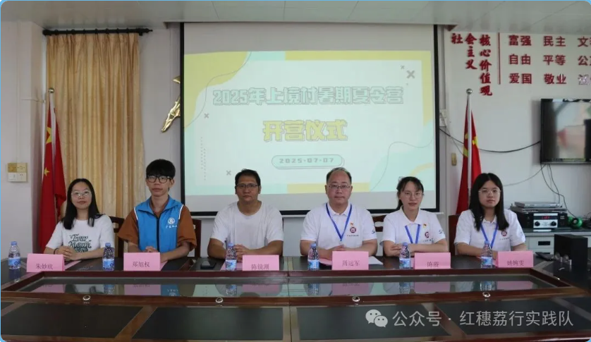 2025年7月7日,蝉鸣荔红,党徽闪亮。在bv伟德国际1946党委的带领下,由优秀大学生党员骨干组成的“红穗荔行梦之队”高举服务乡村振兴的旗帜,走进上境村举行 “‘百千万工程’党员先锋行”暑期社会实践夏令营开营仪式。村委代表、社工代表、学院师生党员与二十余组亲子家庭齐聚一堂,共同开启这场为期10天、融合党性教育与乡村服务的特色实践。此次活动是高校学生党员响应党中央号召,躬身投身乡村振兴主战场,争做“百千万工程”排头兵的生动写照。
