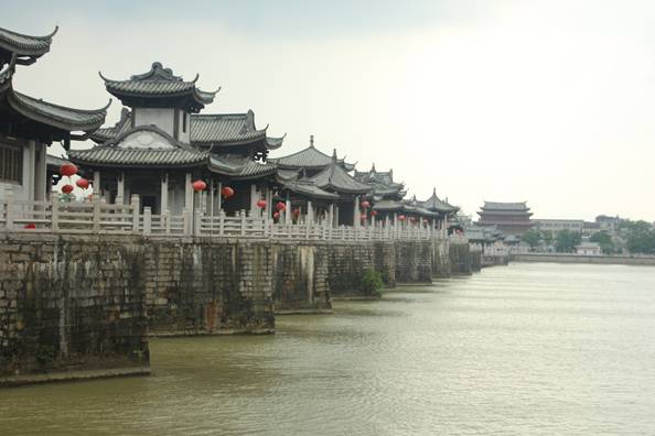 踏上了这座古桥,呈现在我们眼前的是“十八梭船二十四洲”的独特风格。广济桥在每个桥墩上都建有亭阁,每个楼台亭阁用途各异,在江面上排列着,甚为壮观。在亭子的匾额上,书写着不同的内容,有“飞跃”、“涨碧”、“朝仙”、“乘驷”等;亭子的楹联也各不相同,有“瀛洲景美赋诗来,沧海月明吹笛去”、“峰低山让月,舟小水亲人”等,真可谓是重领联阁,济美联芳。
