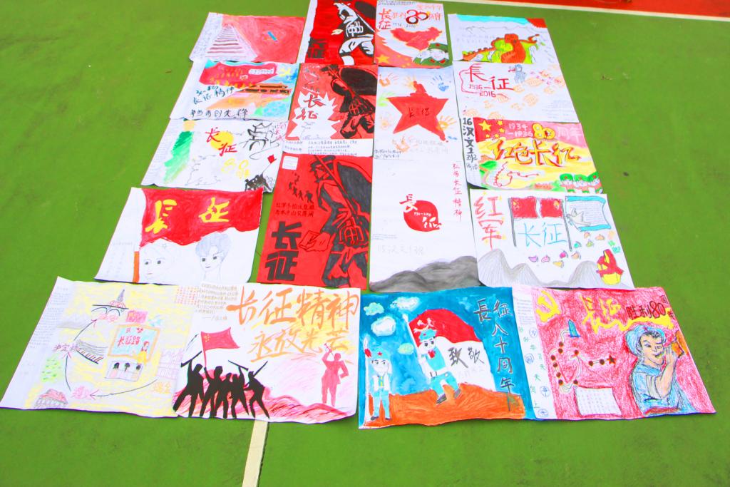 海报创作这一环节在篮球场的角落进行,有用水彩笔的也有用蜡笔的,方式各异,图案五花八门,创作者把一张张白纸变成五彩缤纷、内容丰富的长征图,形象地还原了当年长征时的画面。