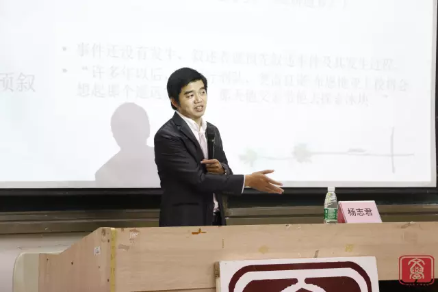 最后,杨志君老师从叙事视角、叙事结构、叙事时间等论文写作方向讲解,并给同学们展示了他的一些论文,使同学们更深刻地了解到论文写作的知识。同时他还建议同学们应尽早尝试去接触论文,并提醒我们对所研究的文著应该读全集原著,应该读熟、读透,为以后的毕业论文的写作积累素材。
