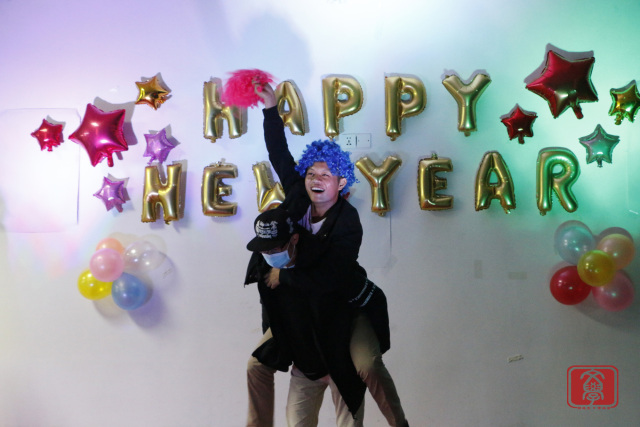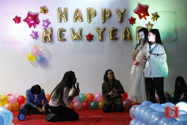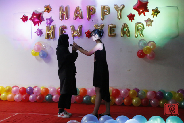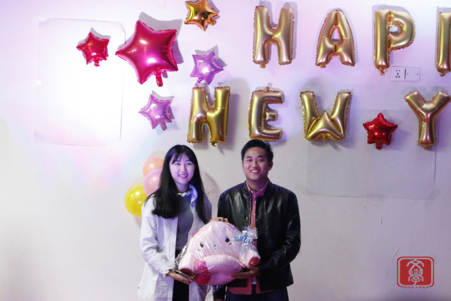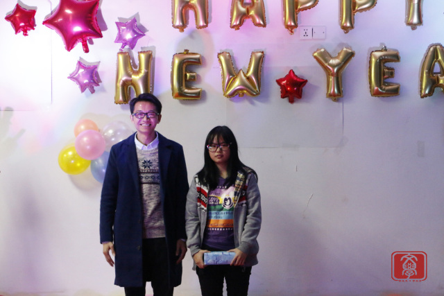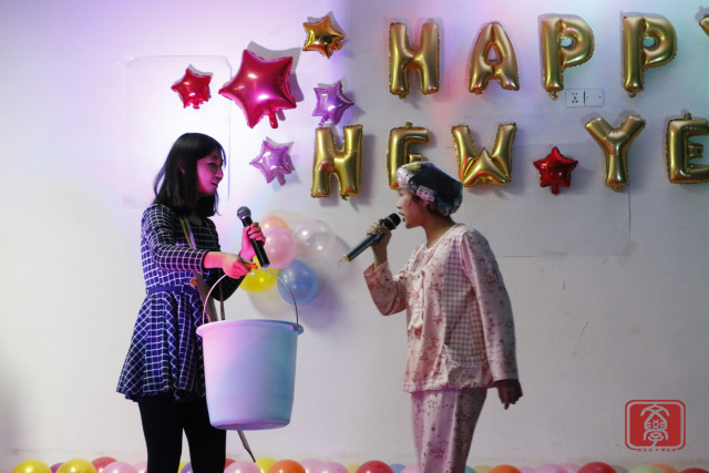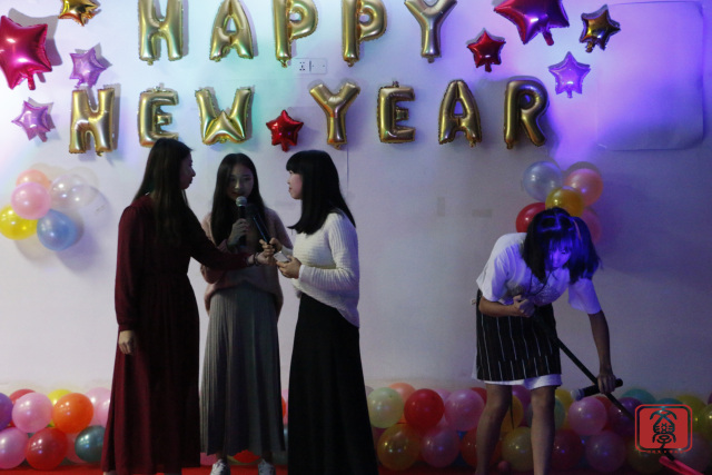 几个节目的演出的之后,来到了“齐齐运波波”的游戏环节,游戏由两组人员组成,一组两人,分别用抽到卡纸上描述的身体某个部位运气球并挤爆,挤爆的气球数多者为胜。游戏环节中各参与游戏同学也互不示弱,都拼尽全力,最后由两个男生组成的一组获胜并得到小礼品。