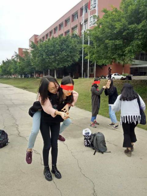 15级广告学1班的同学们则以游戏的形式,学习如何与他人合作和相处的技巧。在这个名为“你是我的眼”的游戏中,由一个被蒙眼的同学背另一个同学,并前行到目的地踩爆气球,这个看似简单的小游戏,实际上是背上的人双脚不能着地,背人者不能用眼睛看。它教会了同学们要完成一件事,必须采取合作的态度,也提醒了同学们团体合作的基础是相互信任。这些正是我们能从习总书记的和平与合作的外交之道中学会的。
