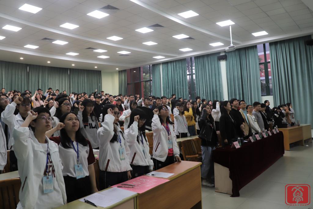 紧接着,进入第二项议程——宣誓仪式。在座学生全体起立,右手握拳,庄严地宣誓:努力营造温暖和谐的家园,做一个讲文明,重安全 ,守纪律的大学生。