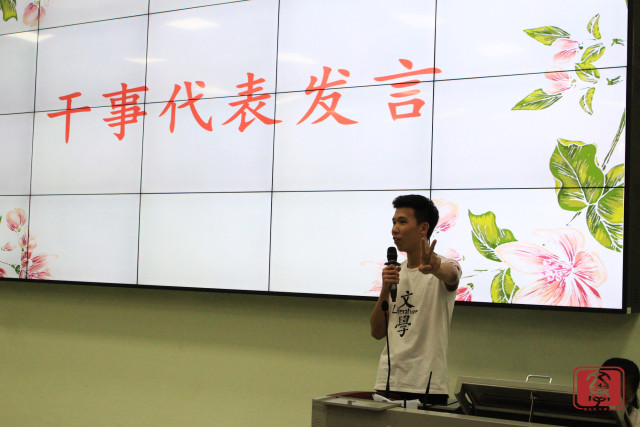 大会伊始,由学生代表,文娱部干事郑一伟上台发言。他首先总结了自己在团学一年内的工作,同时也表达了他在团学中的感受:团学就像家一样,充满温情。在团学的一年里,他收获了不仅仅是经验,更多的是友情。他也表达了希望团学未来发展越来越好的愿望,这同时也是所有文学系团学人的愿望。