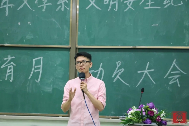 大会伊始,文学系学生会主席李存璞师兄代表宣读倡议书。倡议书提出以下几点:学生应当重视安全,珍爱生命;学生在提高自身道德修养的同时,努力学习科学文化知识;端正学习态度,履行校训校纪校规,严于律己,争做先锋模范。