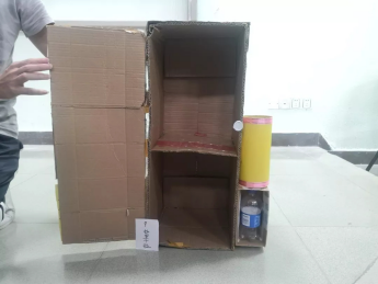 设计理念:“五味馨香”小橱柜,厚纸板做成了门,开关自如;里面中间有一层小纸板,可以活动自如;旁边粘着可以盛油的小瓶子和放筷子的纸筒,方便实用,是一个吃货应备小橱柜!