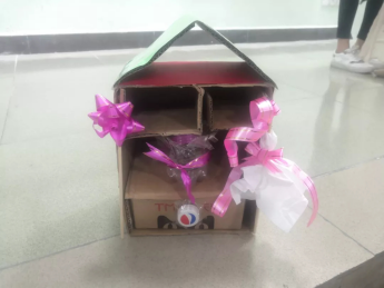 设计理念:温馨小房子,里面用纸板隔开,可以放一些小东西;房子第一层是一个小抽屉,可拉动;加上一个简单的小笔筒,以及彩带的装饰,小房子美妙绝伦。