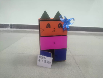 设计理念:方便女孩子用,化妆品什么的,要及时收拾,所以用这个小箱子来收拾这些东西,还给它穿上了衣服。因为她们喜欢可爱的小猫咪,所以外形也是一个猫的样子,所画猫咪眼神呆萌,笑容腼腆,令人欢喜。