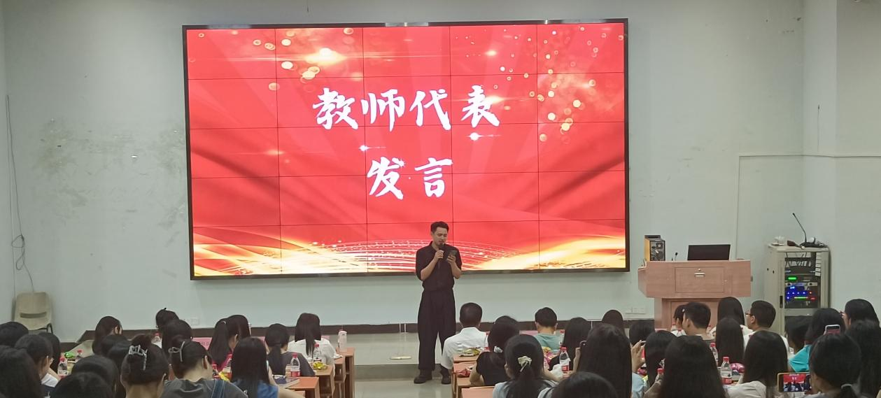 教师代表黄厚斌老师上台发言,他用自己的经历告诉大家,无论未来路有多么艰难,都要坚持自己的梦想,勇往直前。