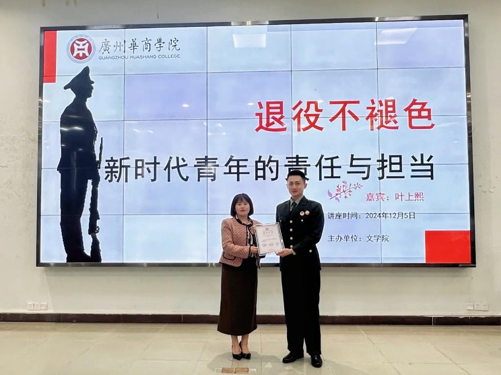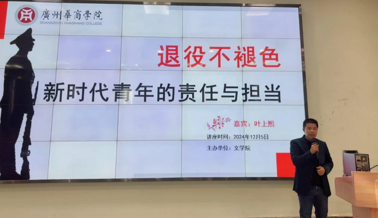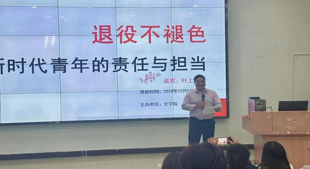 为进一步发挥退役复学大学生士兵典型事迹的引领作用,继承和发扬经部队淬炼形成的光荣传统和优良作风,为他们搭建更广阔的发展平台,鼓励他们在校园内挺膺担当,bv伟德国际1946于2024年12月5日在广州校区举办了以“退役不褪色—新时代青年的责任与担当”为主题的讲座。本次讲座的主讲人是bv伟德国际194622级本科汉语言文学4班的叶上熙同学。出席本次讲座的领导与嘉宾有伟德国际victor1946副校长许娜、学生处处长黄国富、bv伟德国际1946党委副书记郭堪通、学校武装部老师郭锦荣、bv伟德国际1946学工办副主任王桂华等,有180多名学生参加了此次讲座。