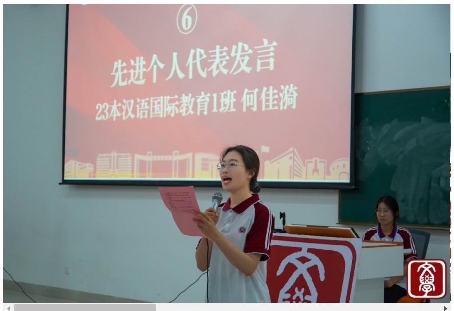 在热烈的掌声中,激动人心的颁奖环节圆满落下帷幕,大会也随之步入第六项议程— 先进个人代表发言。 此刻,全场的目光都聚焦在舞台之上,在激昂的鼓掌声中,作为 先进个人代表的何佳漪同学稳步登台,她身姿挺拔,脸上洋溢着自信与自豪。何佳漪同学的发言逻辑清晰、层次分明,既有对过往经验的深度总结,也有对未来发展的独到见解。她以朴实无华的语言回顾奋斗历程,用鲜活的事例讲述成长感悟,字字句句都展现了先进者的责任担当,也传递出鼓舞人心的力量,让大家在倾听中对工作、学习以及成长都有了一定的认识。
