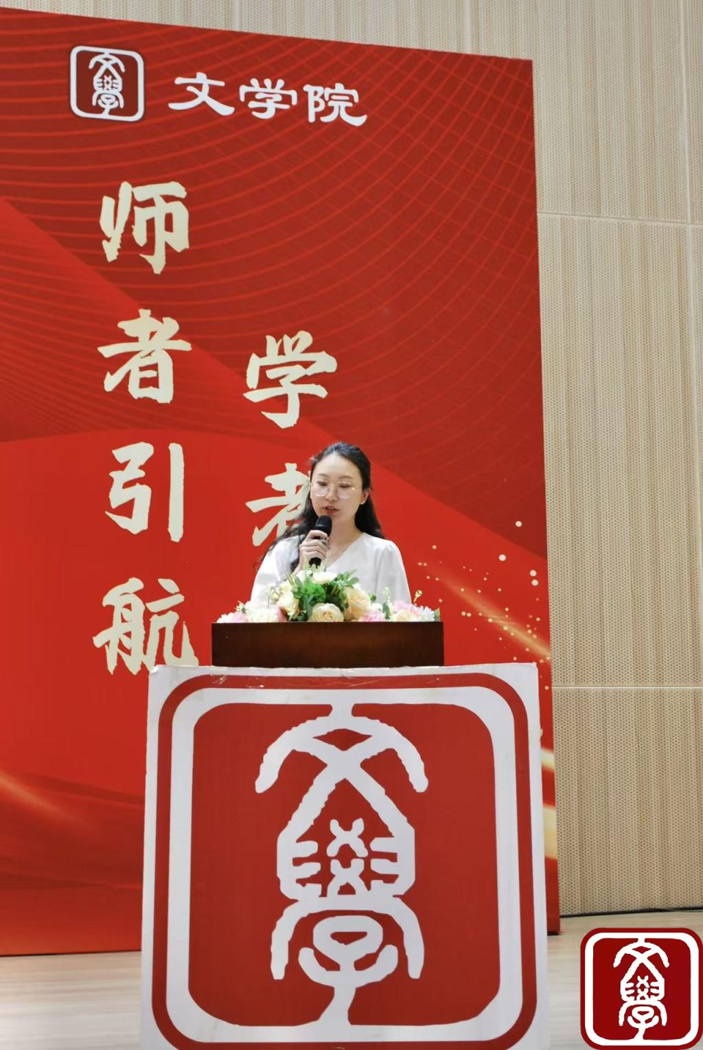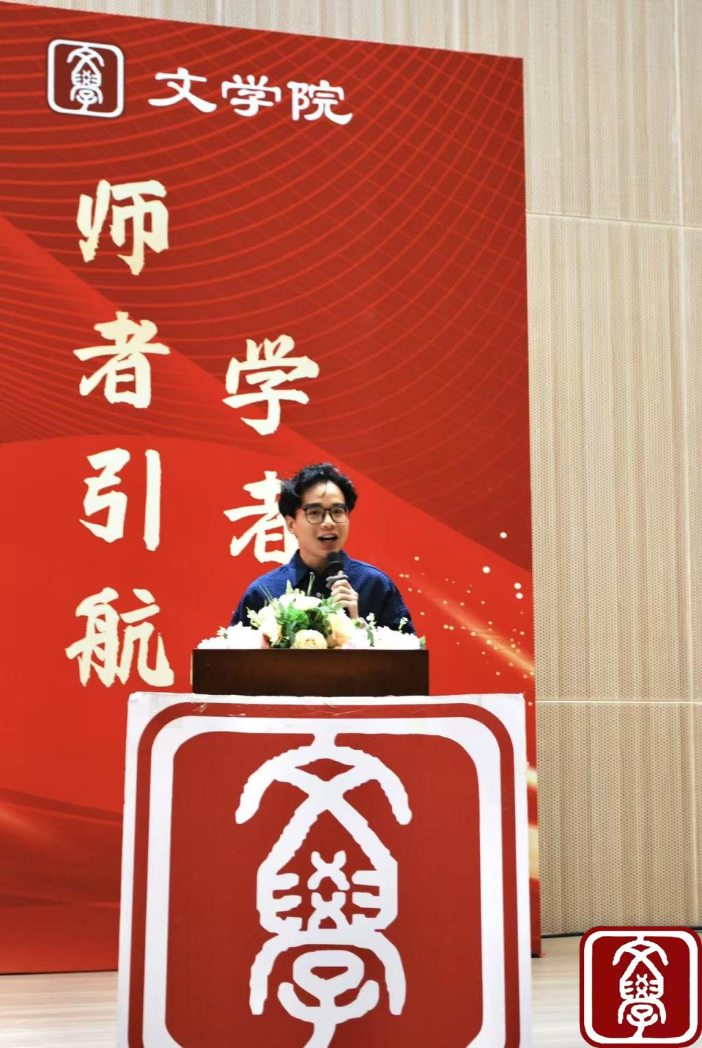 新生代表徐绮镟的发言满含青春朝气,她分享从“应试作文”到领悟文学真谛的转变,誓言以笔为犁,在《诗经》的吟唱与时代的浪花中耕耘“文学春天”;老生代表邓诗晴则以过来人之姿,分享“明确目标、善用资源、深耕实践、常怀感恩”的成长心得,为学弟学妹送上诚挚祝福。