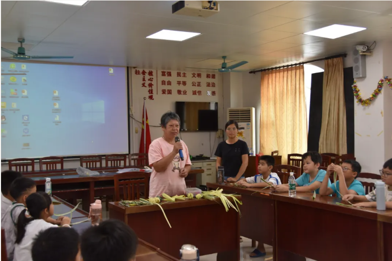 教室特别热闹,两位草编技艺传承老师给每位小朋友发放了裁剪好的草叶,并向大家展示已制作好的草编菠萝、花篮等精美草编品,瞬间把大家带入了非遗的世界。老师向大家介绍自己已有二十多年的编织经验时,听得小朋友们眼睛都亮了,充满了对老师的敬佩。 这节课,草编老师教大家制作草编小鱼。两位老师耐心地手把手教小朋友编织手法,实践队地老师也在协助小朋友们,看着小朋友们从一开始的手忙脚乱,到最后举着自己歪歪扭扭却充满成就感的作品欢呼,小书荔突然感受到:这就是传承的力量呀!这门手艺里藏着的是“执着专注、精益求精”的工匠精神,作品里展现的是博大精深的中华优秀传统文化,我们一定要把非遗文化的根脉扎得更牢固噢!