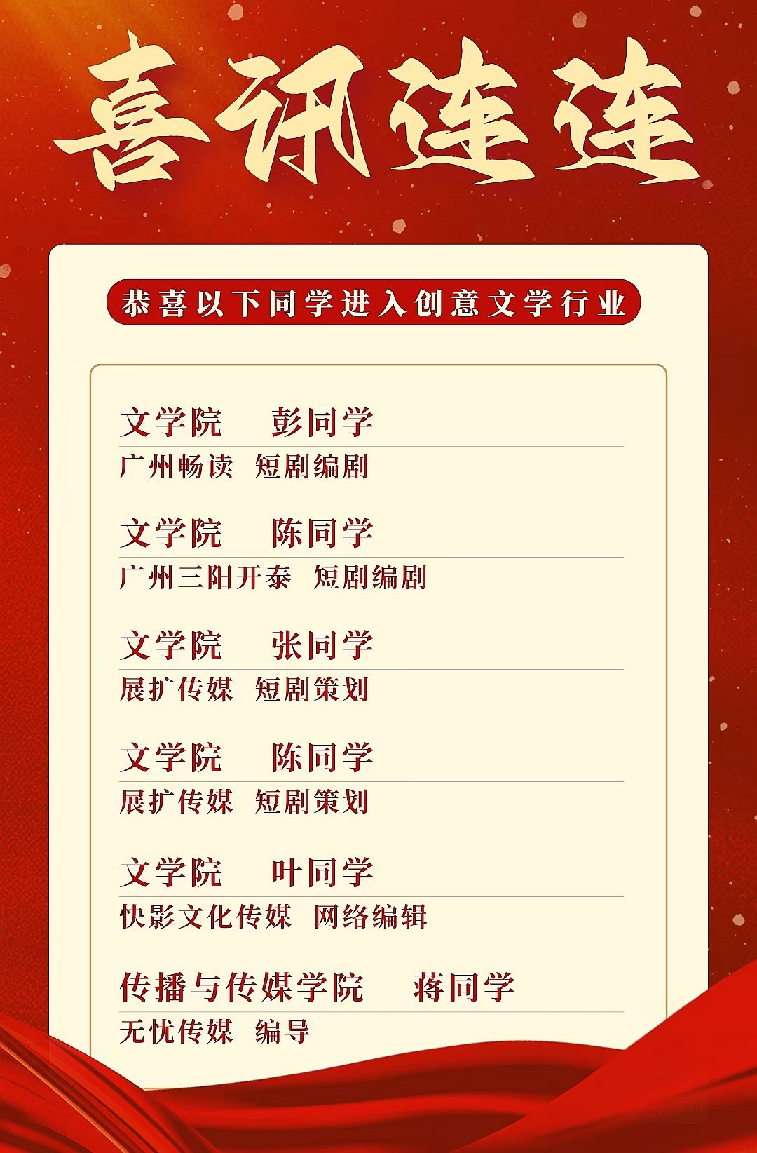 这些在创作实践中绽放光彩的作品,不仅是同学们才华与努力的见证,更成为他们敲开职场大门的 “通行证”。 这批优秀学子凭借在创意文学领域锤炼的过硬本领,在行业中崭露头角,目前毕业生已就业人数近40人,学院还为大家推荐了近20家就业单位,专属于他们的就业喜报,正接连传来。
