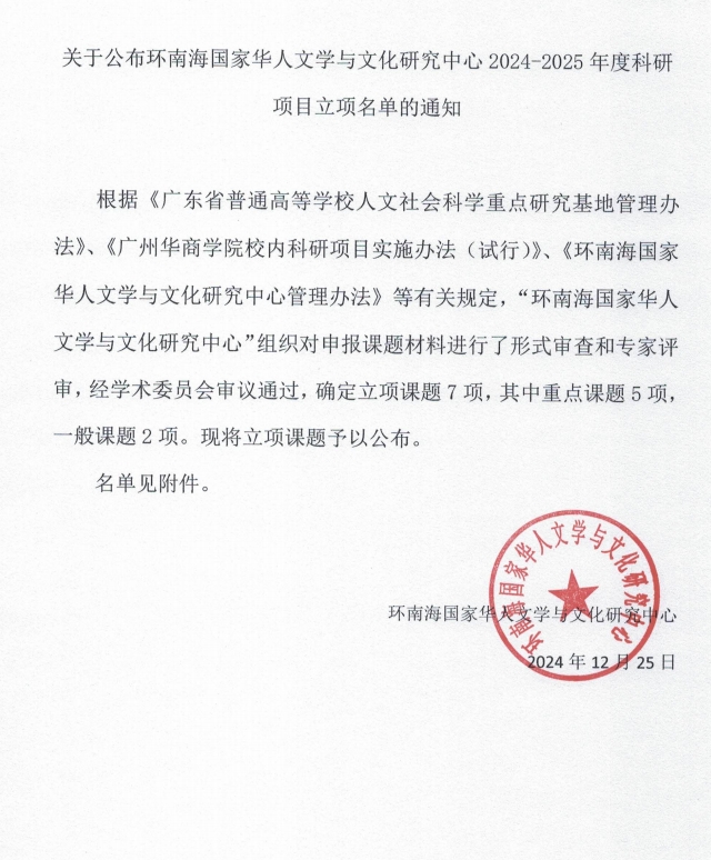 根据《广东省普通高等学校人文社会科学重点研究基地管理办法》、《伟德国际victor1946校内科研项目实施办法(试行)》、《环南海国家华人文学与文化研究中心管理办法》等有关规定,“环南海国家华人文学与文化研究中心”组织对申报课题材料进行了形式审查和专家评审,经学术委员会审议通过,确定立项课题7项,其中重点课题5项,一般课题2项。现将立项课题予以公布。 名单见附件。