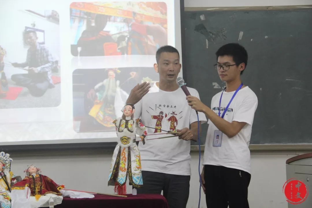 眼见同学们情绪高涨,许端杰先生进行了一场即兴表演。唱声悠悠,曲调激昂,一曲《闯幽州》道尽杀敌报国的豪情壮志;敲锣打鼓,乐声阵阵,《太子出京》再现上层贵族的雍容华贵。只见那木偶容若微磐,飘然翼然,肩状若流,足如射箭,恍若活人,真假难辨。同学们看的如痴如醉,完全沉浸到戏曲当中。