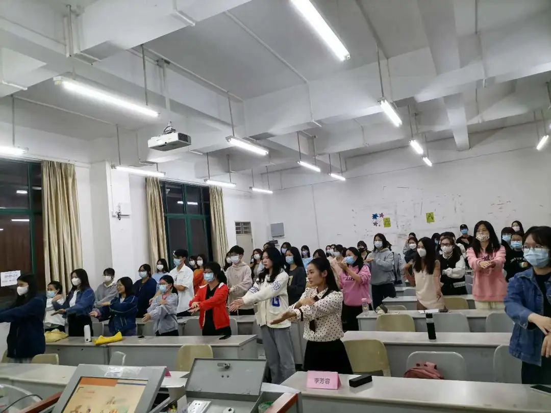 最后,王教授让全体同学起立,在她的带领下共同完成了一个简单的舒缓身心的体操