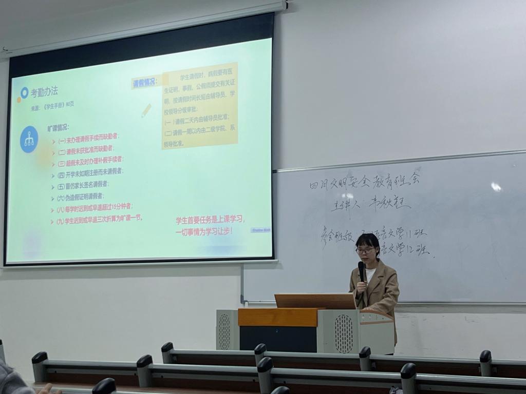 最后,还着重强调了文明,如上课不带早餐进教室,尊重每一位任课老师,同时注重言行举止和着装作为一名当代大学生,我们更应该传承大学生的优秀文化,积极响应学校号召,争做文明大学生,展现当代大学生应有的风采。